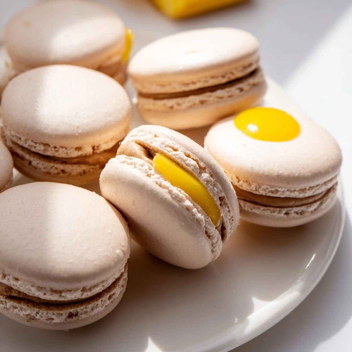 These delicate French macarons feature crisp almond shells sandwiching a luscious milk chocolate ganache inspired by the iconic Cadbury Creme Egg. The filling combines melted Cadbury Dairy Milk chocolate with heavy cream, golden syrup, and butter for an ultra-smooth, creamy consistency. A center dollop of yellow-tinted ganache mimics the beloved egg yolk center, creating both visual appeal and nostalgic flavor. Best enjoyed after 24 hours of resting, allowing the shells to soften slightly and meld with the rich chocolate filling.