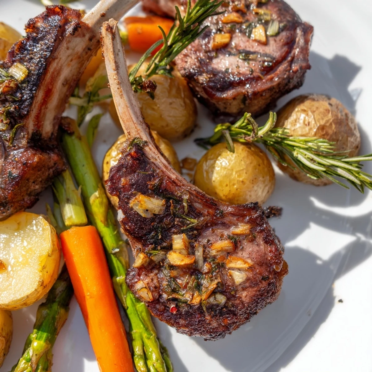 This festive Easter spread brings together succulent lamb chops with baby potatoes, carrots, asparagus, and red onion, all roasted together with fresh herbs, garlic, and lemon. The sheet pan method means everything cooks in harmony while you enjoy time with family. Root vegetables get a head start in the oven, then lamb and tender asparagus join for the final roast. Fresh rosemary and thyme infuse every bite, while bright lemon adds a celebratory touch. Perfect for feeding four with beautiful presentation and effortless cleanup.