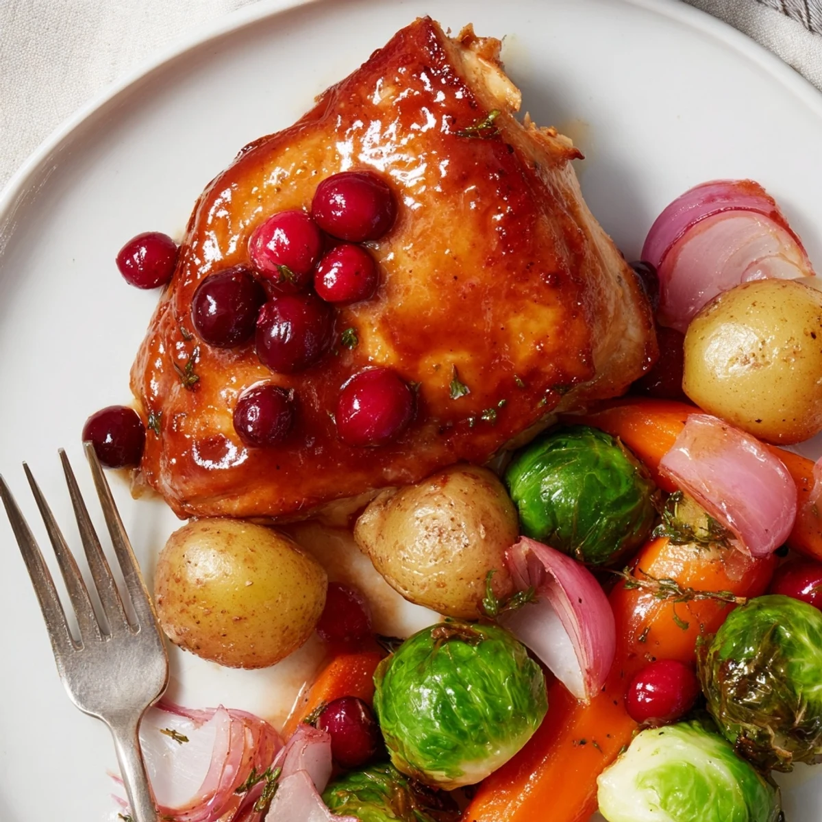 This vibrant one-pan dinner features juicy chicken breasts coated in a sweet and tangy honey cranberry glaze, roasted alongside colorful seasonal vegetables. The combination of balsamic vinegar, Dijon mustard, and fresh thyme creates a balanced flavor profile that pairs perfectly with roasted baby potatoes, Brussels sprouts, red onion, and carrots. Ready in just 50 minutes with only 15 minutes of prep, this wholesome meal is perfect for busy weeknights when you want something nutritious and delicious without spending hours in the kitchen or dealing with a sink full of dishes.