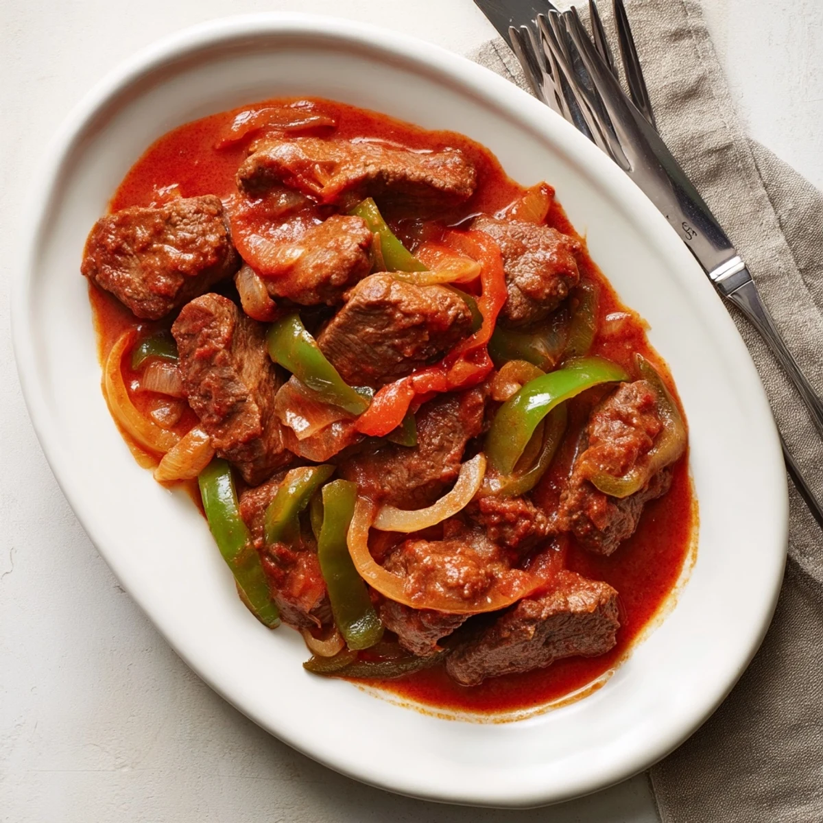 This classic American comfort dish transforms economical beef round steak into fork-tender perfection through slow braising. The beef gets coated in seasoned flour, seared until golden, then simmered for hours in a robust tomato-based sauce with onions, bell peppers, celery, and garlic.