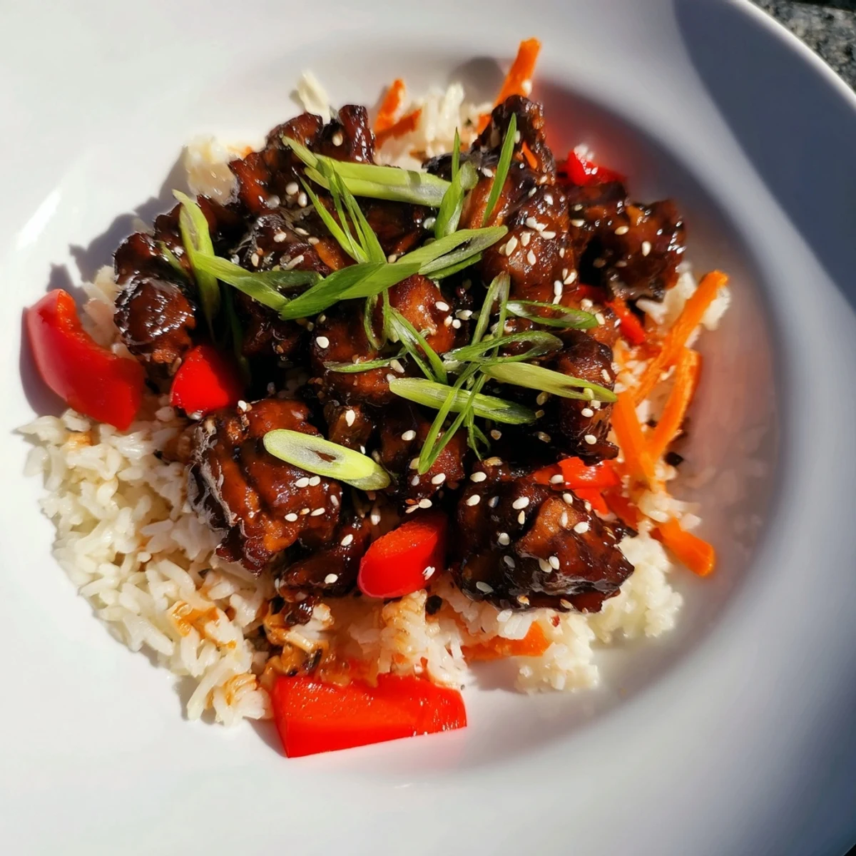 This hearty skillet brings together tender pieces of chicken thighs marinated in a rich Korean BBQ blend with soy, sesame oil, garlic, and ginger. The meat cooks alongside colorful vegetables like bell peppers, onions, and carrots, while rice simmers directly in the same pan, absorbing all those delicious flavors. Ready in under an hour, this meal comes together with minimal cleanup—just let everything cook together, fluff the rice, and top with fresh green onions and sesame seeds. Perfect for busy weeknights when you want something satisfying and full of flavor.