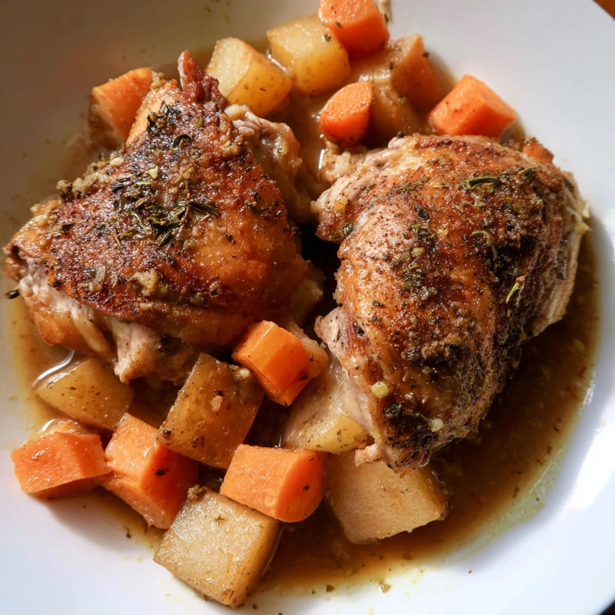 This comforting chicken dinner features tender thighs slow-cooked with root vegetables like carrots, potatoes, onions, and celery. The herb-infused sauce combines thyme, rosemary, and paprika for rich flavor. Simply season the meat, brown it if you prefer deeper taste, then layer everything in your slow cooker with chicken broth. Six hours later, enjoy fork-tender chicken and perfectly cooked vegetables. Optional white wine adds richness, while fresh parsley brightens the final dish.