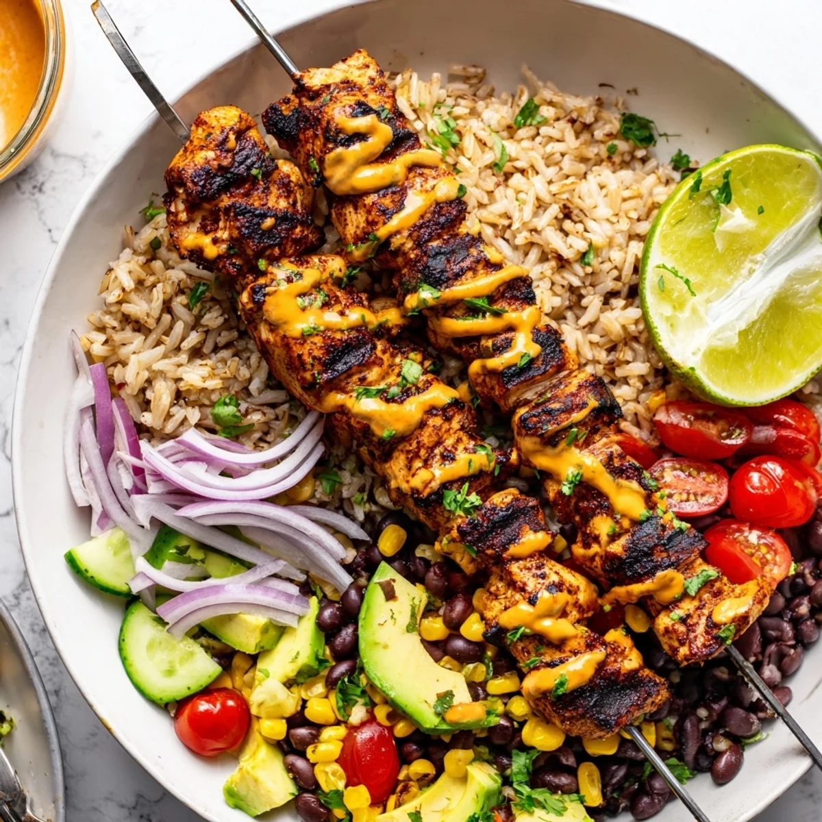 Marinate bite-sized chicken thighs in olive oil, smoked paprika, garlic, cumin, chipotle and lime for 15+ minutes. Thread onto skewers and grill 4–5 minutes per side until charred and cooked through. Serve over brown rice with black beans, corn, tomatoes, cucumber, avocado and a lime-smoked paprika yogurt drizzle. Swap chicken for tofu or shrimp and refrigerate leftovers for 3–4 days.